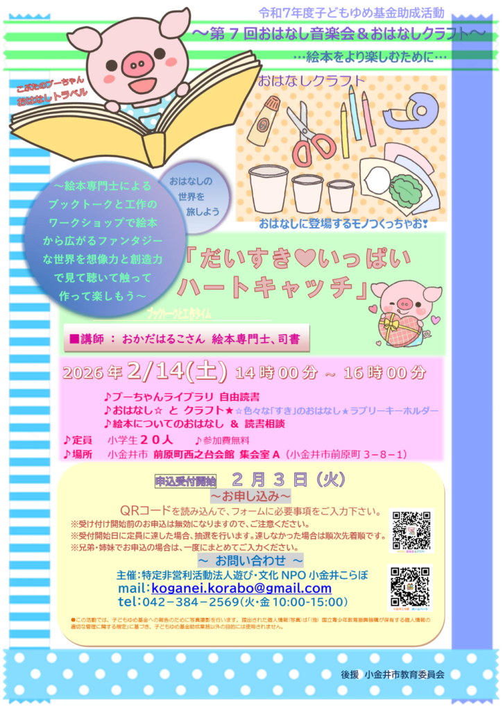 ◆2026/2/14(土)14:00-16:00 小金井市前原西之台会館集会室A(小金井市前原町3-8-1) 小学生 申し込みあり ¥0