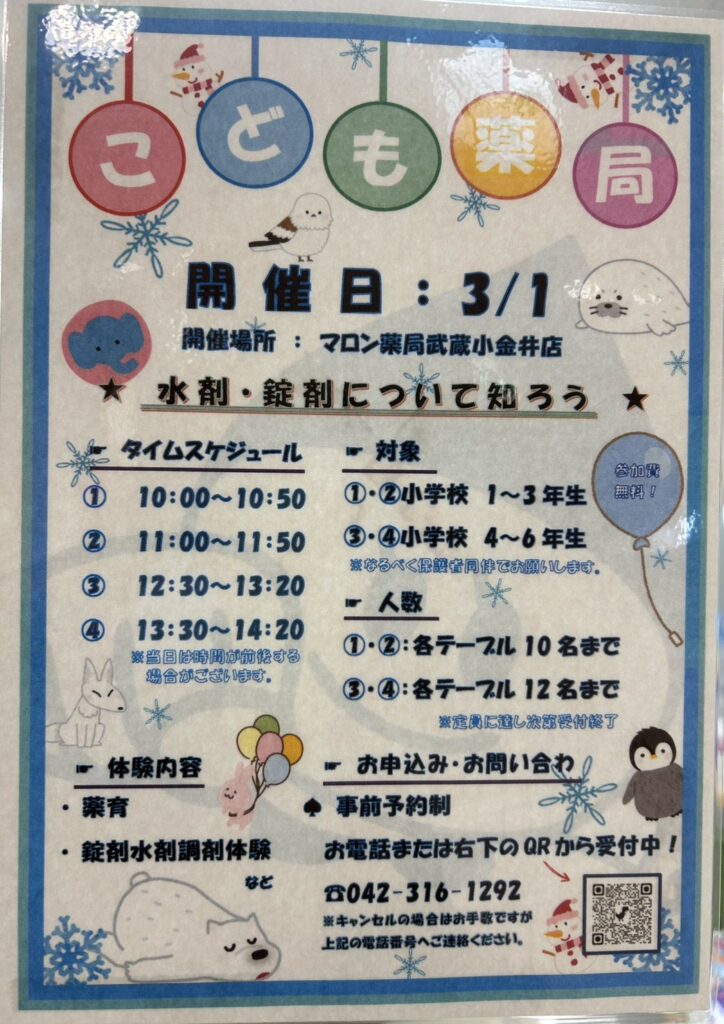◆2026/3/1(日)①10:00-10:50②11:00-11:50③12:30-13:20④13:30-14:20 マロン薬局武蔵小金井店 ①,②小学校1〜3年生、③,④小学校4〜6年生 申し込みあり ¥0 >申し込みはこちら