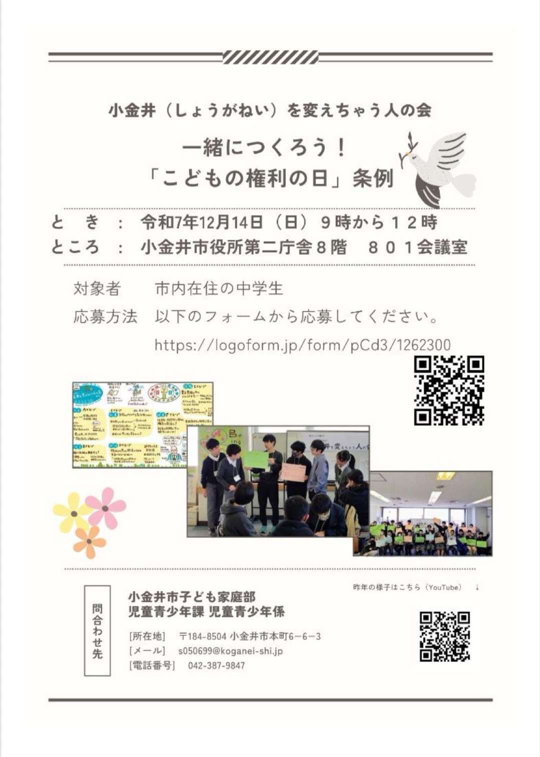 ◆2025/12/14(日)9:00-12:00 小金井市役所第二庁舎8階801会議室 中学生 申し込みあり ¥0