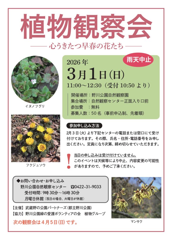 ◆2026/3/1(日)11:00-12:30 野川公園自然観察園 申し込みあり ¥0