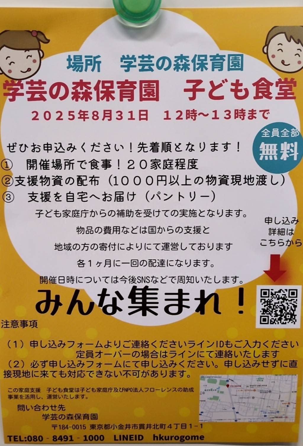 ◆2025/8/31(日)12:00-13:00 学芸の森保育園 申し込みあり