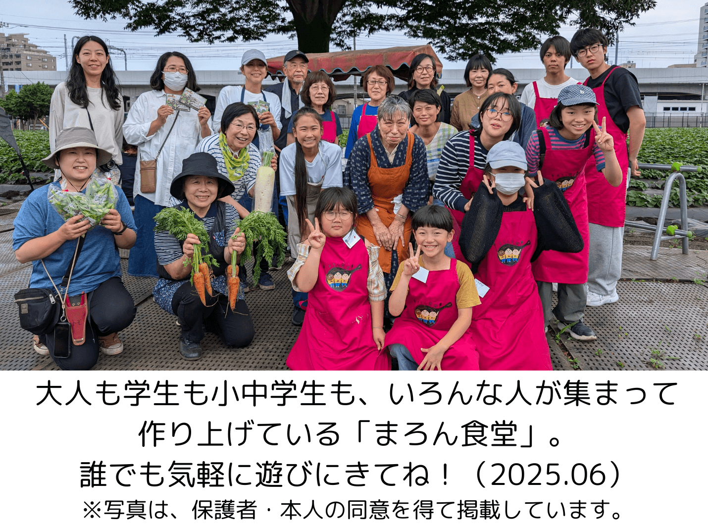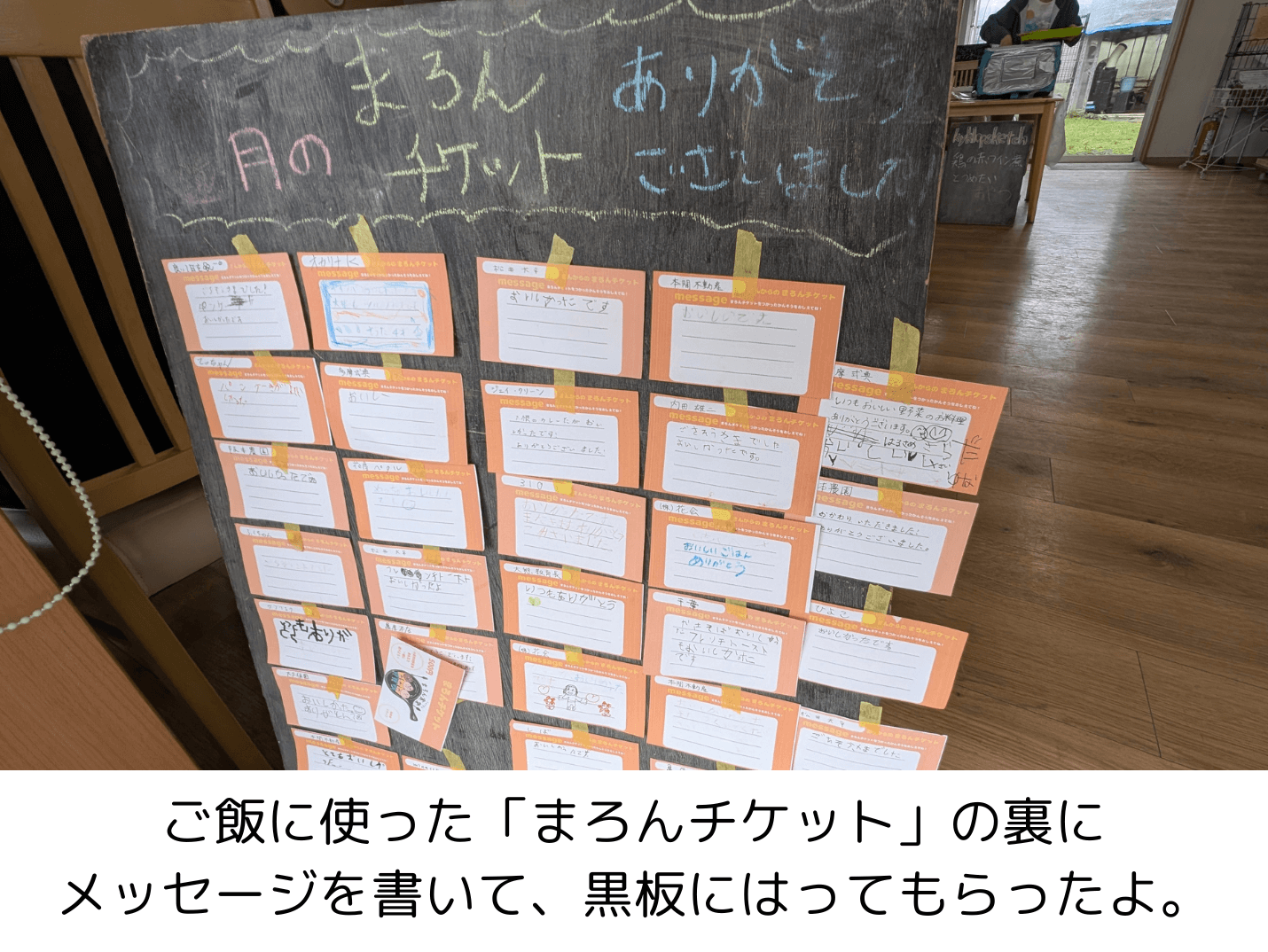 参加費)こども(大学生まで)は、地域のこどもを想う大人の方たちが購入してくれたまろんチケットによって無料で食事が出来ます。